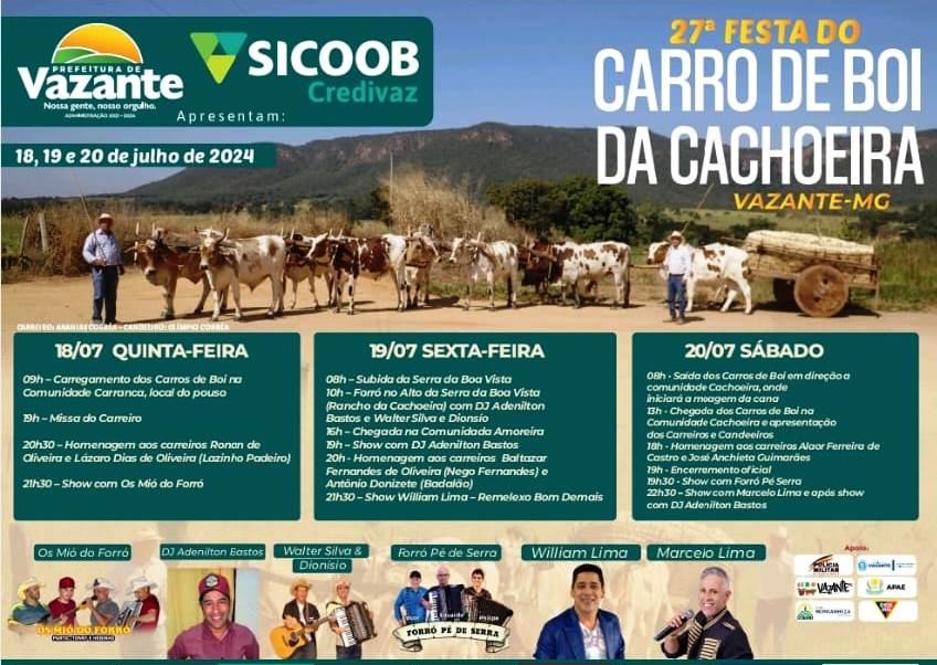 Evento importante da cultura rural de Vazante, que mais evoluiu em termos de estrutura, organização e atração de público nos últimos tempos, a tradicional Festa do Carro de Boi da Associação dos Carreiros da Comunidade da Cachoeira (ASCCA) está completando 27 anos em 2024.