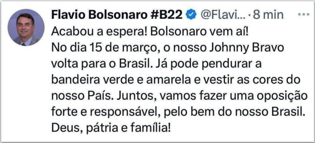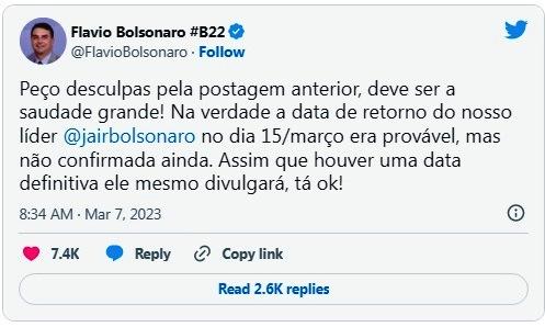 O próprio filho do ex-presidente chegou a usar as redes sociais na manhã desta terça-feira (7) para anunciar que Bolsonaro voltaria ao Brasil no dia 15, mas minutos depois corrigiu a informação por meio de postagem no Twitter.