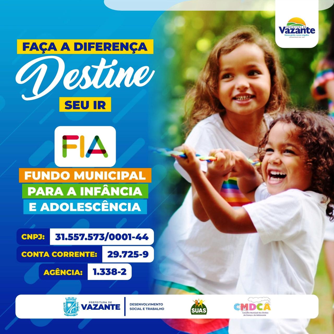 Qualquer contribuinte de Vazante pode impactar positivamente a vida de diversas crianças e adolescentes da cidade em situação de risco ou vulnerabilidade social. Para isto, basta destinar de 1% a 6% do valor do seu Imposto de Renda (IR) ao Fundo Municipal da Infância e Adolescência (FIA).