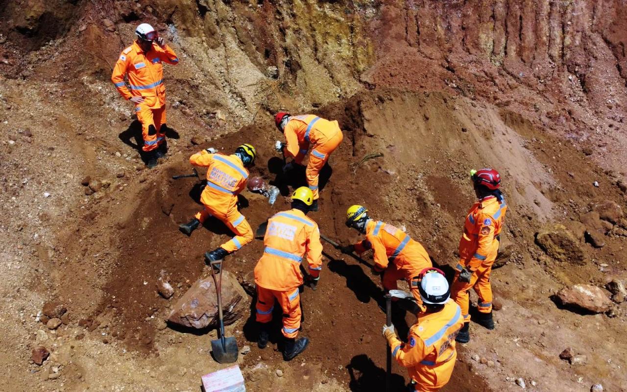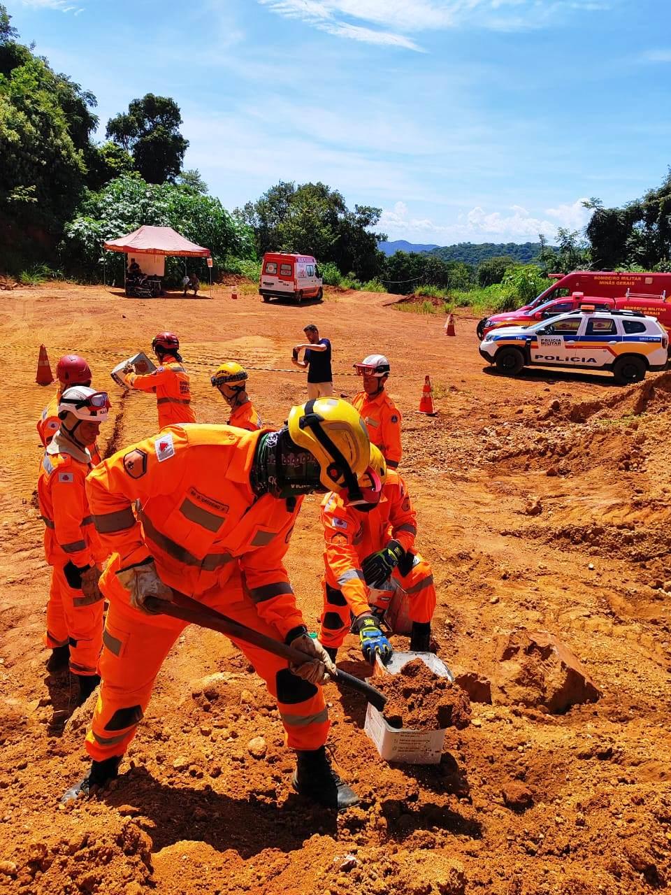 Durante o treinamento prático, os participantes utilizaram técnicas de escavação manual e desmanche hidráulico para resgatar uma pessoa soterrada após um desmoronamento de um talude – terra e rocha.