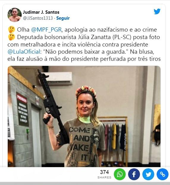 A deputada federal Júlia Zanatta (PL-SC) publicou nas redes sociais uma foto segurando uma metralhadora e fez uma incitação à violência contra o presidente Luiz Inácio Lula da Silva (PT).