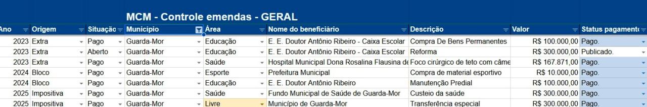 No caso de Guarda-Mor, a parlamentar destinou cerca de R$ 1.278.000,00, com destaque de recursos acima de R$ 460.000,00 para aquisição de um moderno foco de teto com câmera de vídeo para o centro cirúrgico do Hospital Municipal e custeio da unidade hospitalar.