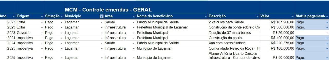 Para Lagamar, os recursos viabilizados pela deputada somaram aproximadamente R$ 1.364.000, incluindo R$ 700.000 para construção de duas pontes de concreto no meio rural e mais de R$ 320.000,00 para aquisição de uma van com mobilidade adequada ao transporte de pessoas com necessidades especiais.