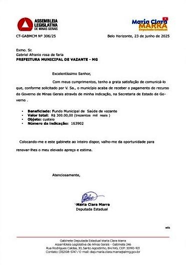 Com a nova emenda, a deputada Maria Clara já viabilizou mais de R$ 4,5 milhões para o município, desde o início do seu mandato, em 2022. Ela também destinou uma verba de R$ 100 mil, que ainda será liberada, para aquisição de um veículo para o Sindicato dos Produtores Rurais de Vazante.