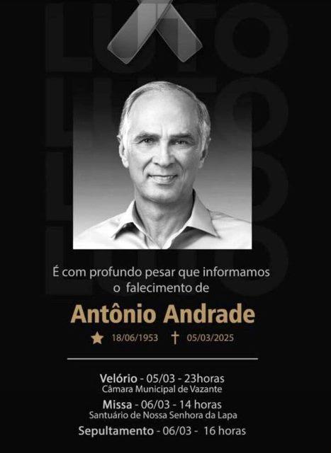 O velório de Antônio Andrade está previsto para hoje, com início às 23h, na Câmara Municipal de Vazante. Nesta quinta-feira (6) haverá missa de corpo presente às 14h no Santuário de Nossa Senhora da Lapa e o sepultamento ocorrerá às 16h no Cemitério Campo da Esperança, em Vazante.