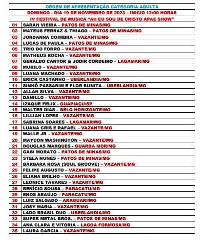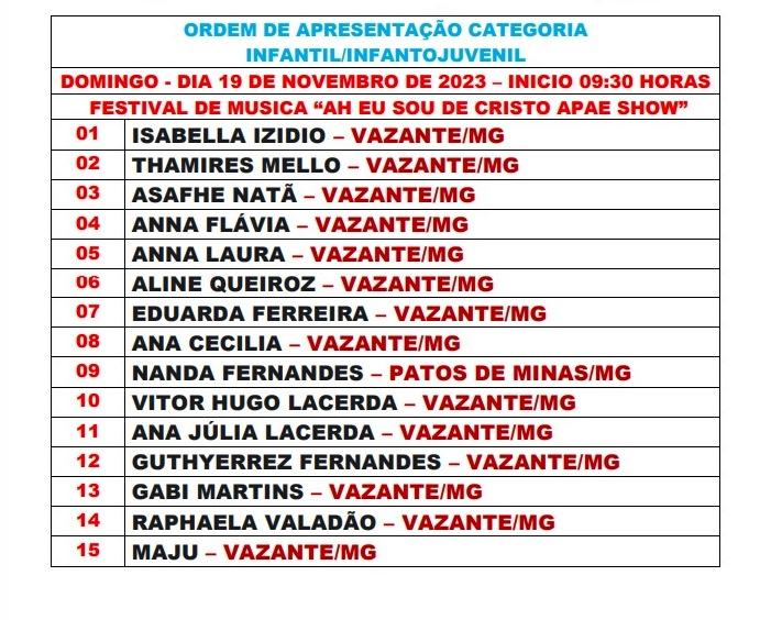 Promovido pela Apae/Vazante e o EAC (Encontro de Adolescentes com Cristo), o festival terá 50 intérpretes, sendo 15 da categoria “Infantil/Infanto-Juvenil” e 35 da categoria “Adulta”.