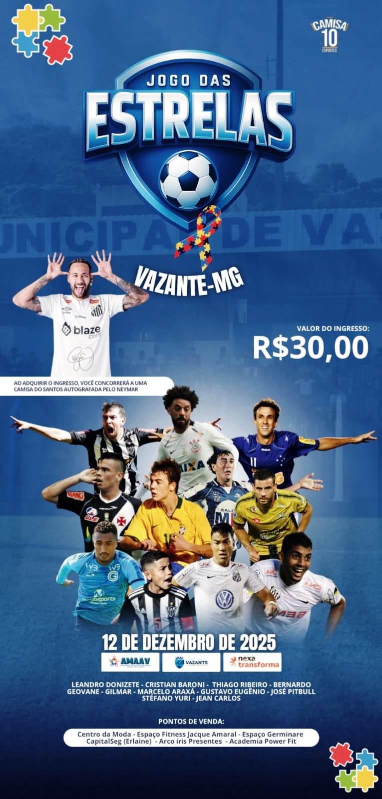 Por iniciativa dos jogadores Stefano Yuri e Jean Carlos, o “Jogo das Estrelas” vai unir futebol e solidariedade em uma grande ação beneficente com toda a renda revertida para a Associação de Mães e Amigos dos Autistas de Vazante (AMAAV).