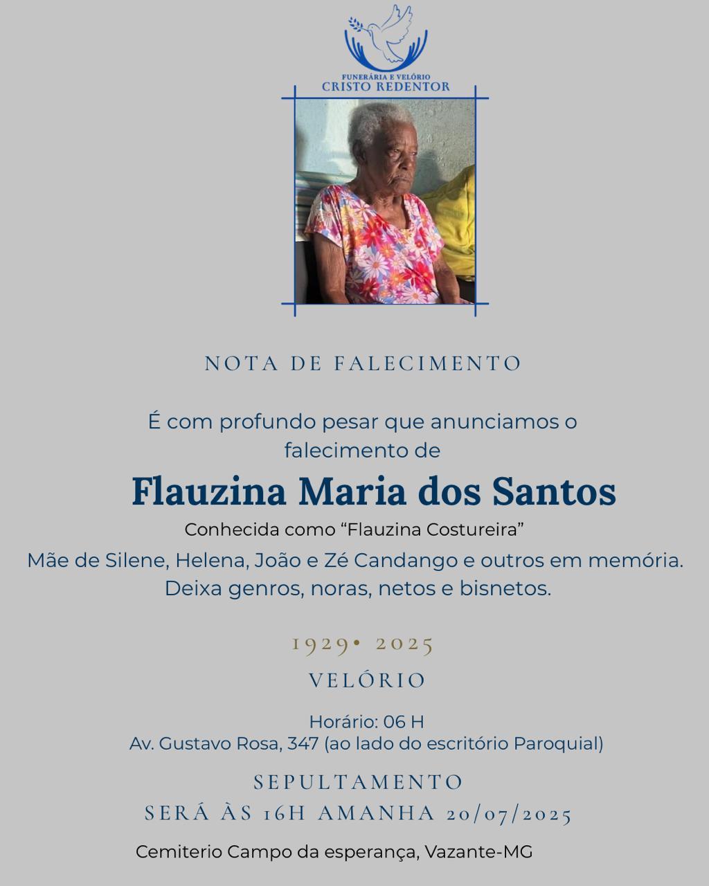 LAMENTAMOS COMUNICAR O FALECIMENTO DE FLAUZINA MARIA DOS SANTOS