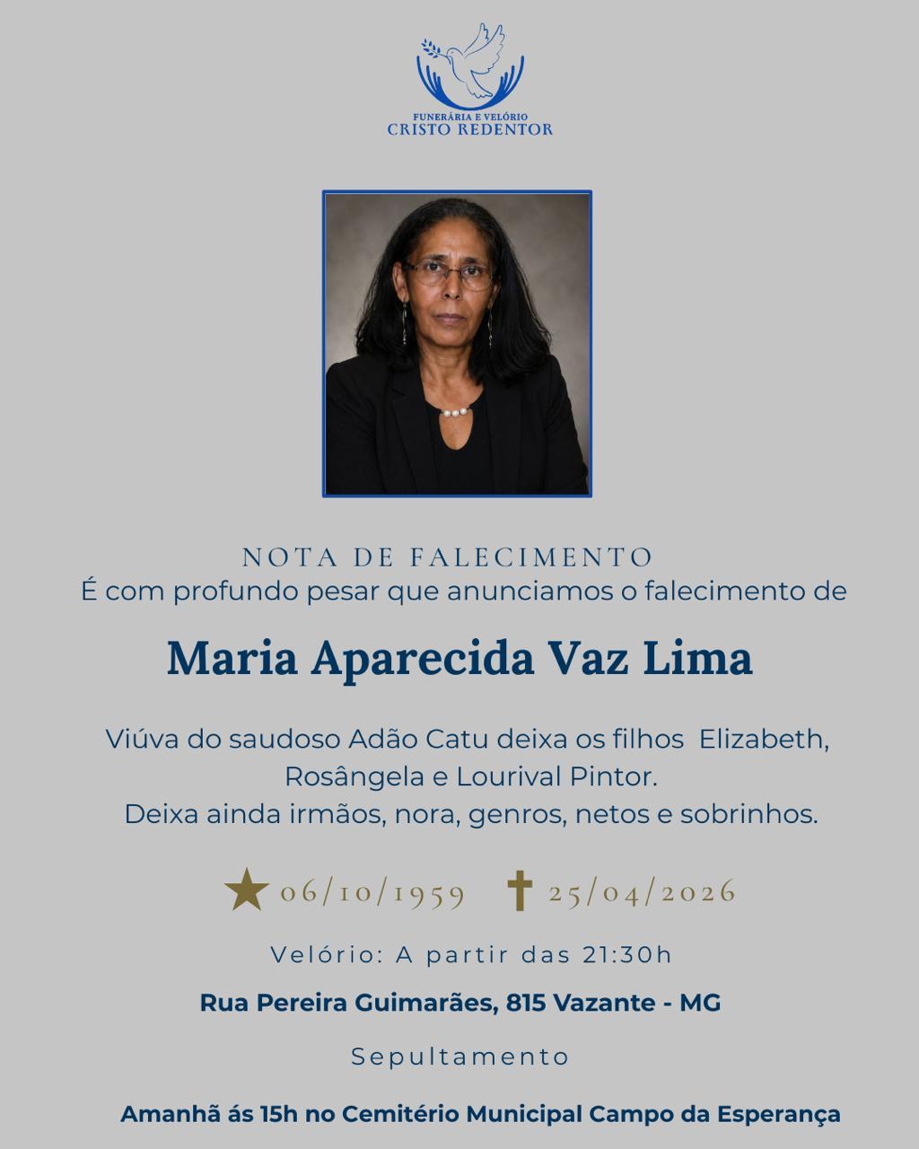 LAMENTAMOS COMUNICAR O FALECIMENTO DE MARIA APARECIDA VAZ LIMA