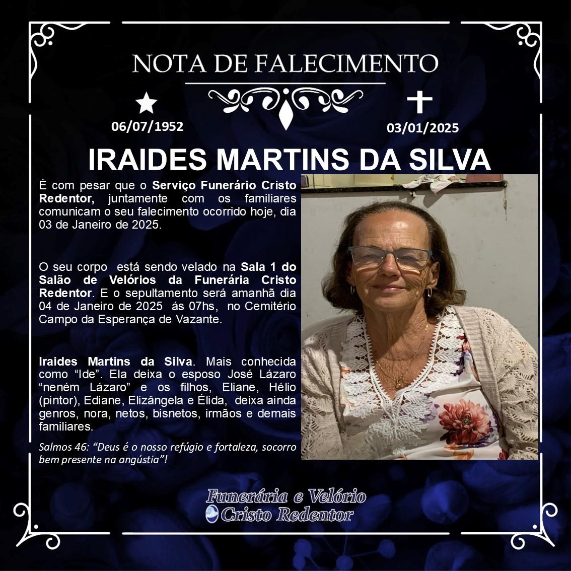 LAMENTAMOS INFORMAR O FALECIMENTO DE IRAIDES MARTINS DA SILVA