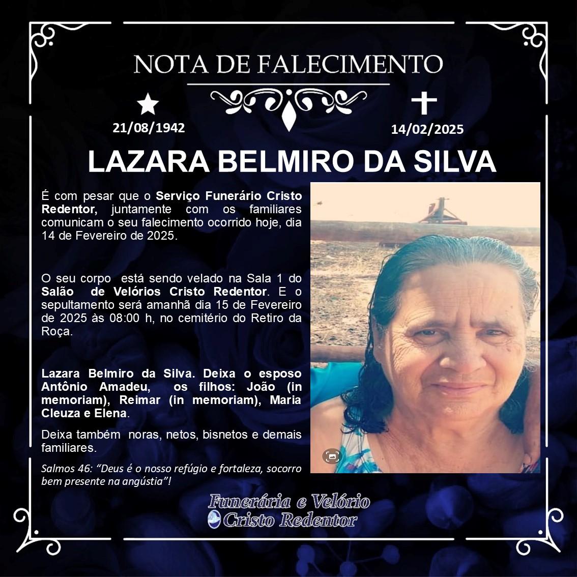 LAMENTAMOS INFORMAR O FALECIMENTO DE LAZARA BELMIRO DA SILVA
