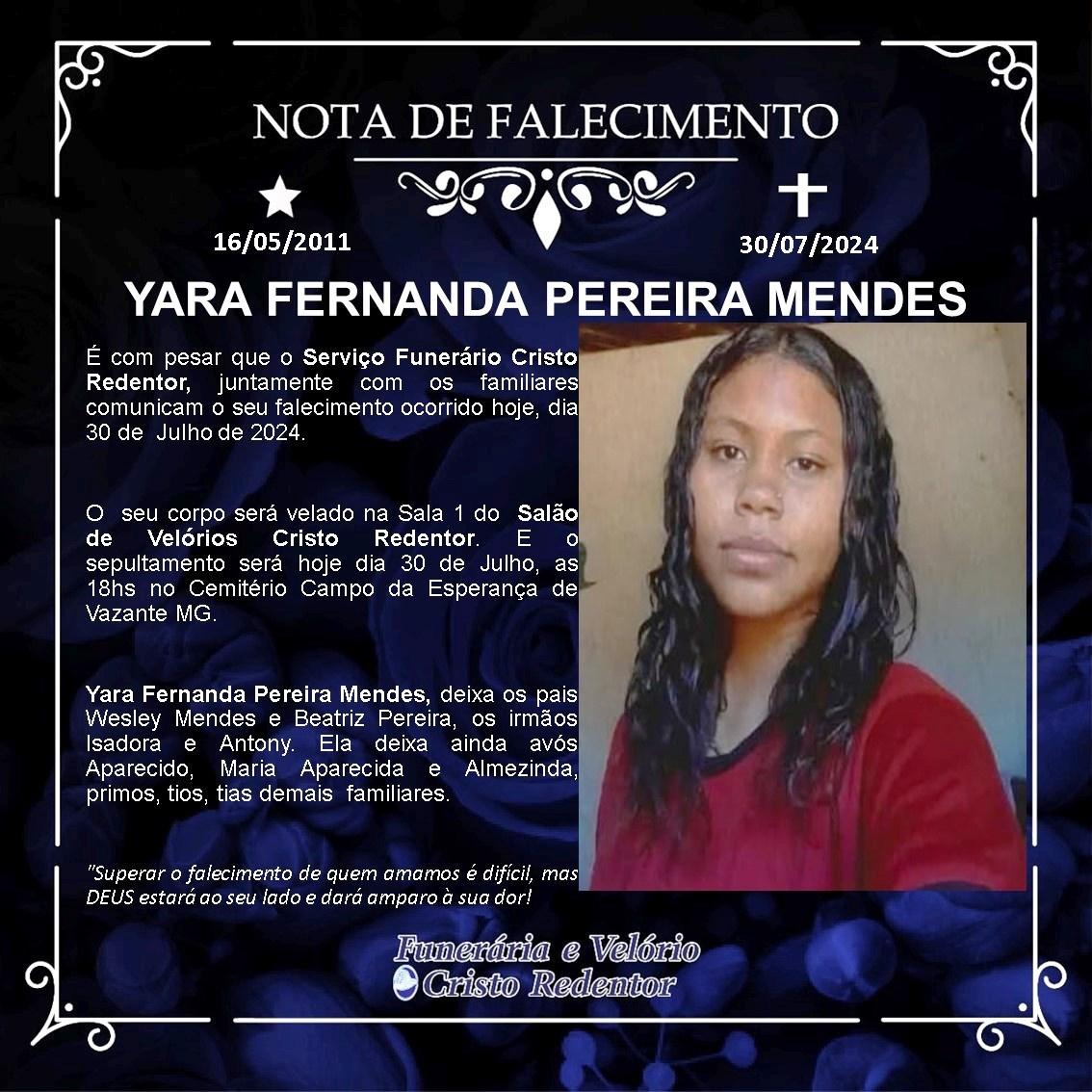 LAMENTAMOS INFORMAR O FALECIMENTO DE YARA FERNANDA PEREIRA MENDES