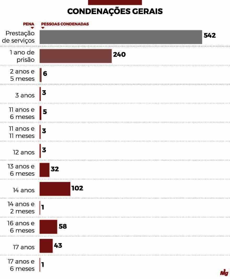 A Procuradoria-Geral da República (PGR) denunciou, ao todo, 1.682 pessoas por envolvimento no ataque as sedes dos Três Poderes, em Brasília. Até o momento, 1.039 pessoas receberam condenação. Dos 497 condenados à prisão, 240 deles receberam pena de apenas 1 ano. Outros 251 respondem por crimes graves, com penas que vão de 3 a 17 anos e seis meses de prisão.