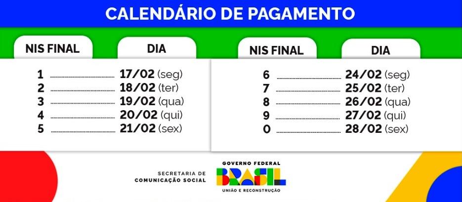 O cronograma de pagamentos teve início nessa segunda-feira, 17 de fevereiro, e segue até o dia 28, de acordo com o final do Número de Identificação Social (NIS), conforme calendário abaixo: