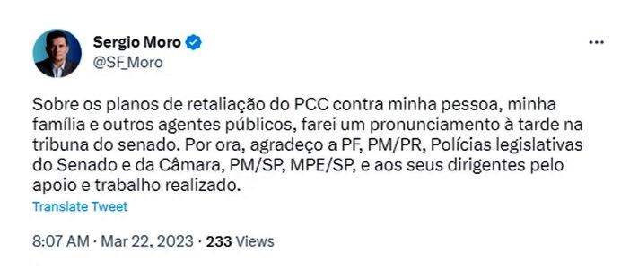 Sérgio Moro informou, por meio de suas redes sociais, que fará um posicionamento sobre o caso, envolvendo planos de retaliação da facção criminosa PCC, nesta tarde na tribuna do Senado.