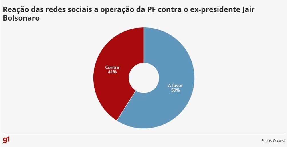 Um levantamento da Quest, divulgado neste sábado (19), mostra que a operação da Polícia Federal (PF) contra o ex-presidente Jair Bolsonaro (PL), realizada nesta sexta-feira (18), recebeu apoio de 59% das menções monitoradas pelo instituto nas redes sociais. Outros 41% dos usuários criticaram a ação e defenderam o ex-presidente.