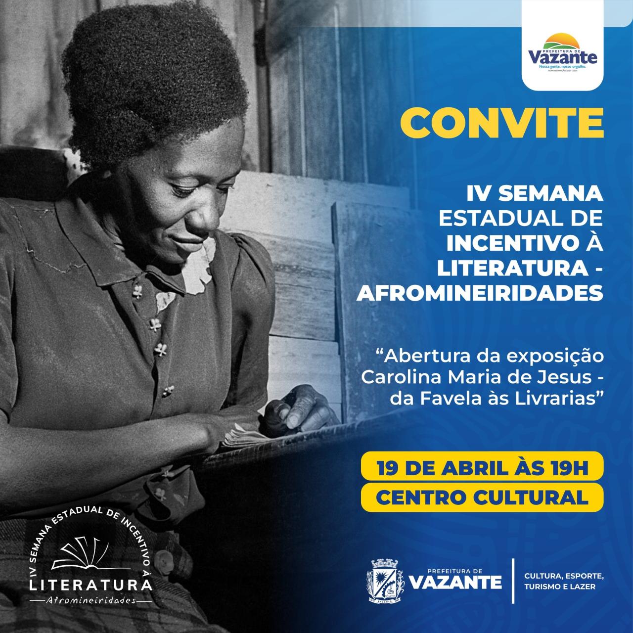 Em Vazante, a programação da IV Semana Estadual de Incentivo à Literatura inclui a exposição "Carolina Maria de Jesus – da Favela às Livrarias", que será aberta ao público nesta sexta-feira (19), às 19 horas, no Centro Cultural, e vai até o mês de maio.