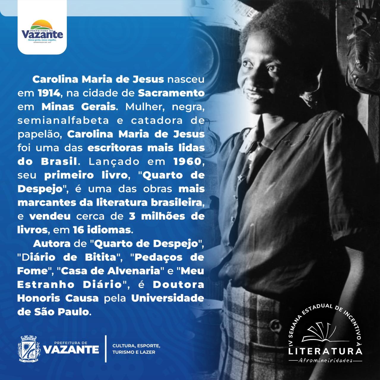 Autora de “Quarto de Despejo”, seu livro mais conhecido, Carolina de Jesus é natural de Sacramento, nascida em 14 de março de 1914, mas viveu a maior parte da sua vida na Favela Canindé, na Zona Norte de São Paulo, se tornando popular em 1960 por revelar o cotidiano da comunidade, onde faleceu em 13 de fevereiro de 1977.